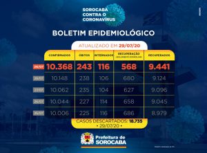 A Prefeitura de Sorocaba, por meio da Secretaria da Saúde (SES), registrou mais cinco novas mortes confirmadas com a Covid-19, nesta quarta-feira (29). Apenas duas mortes ocorreram neste dia, as outras três aconteceram entre os dias 25 e 27 de julho. Ou seja, são dados resultantes de retroalimentação. Já os casos confirmados com a doença passaram de 10.148 para 10.368 na cidade. Os óbitos com a confirmação da doença aumentaram para 243.