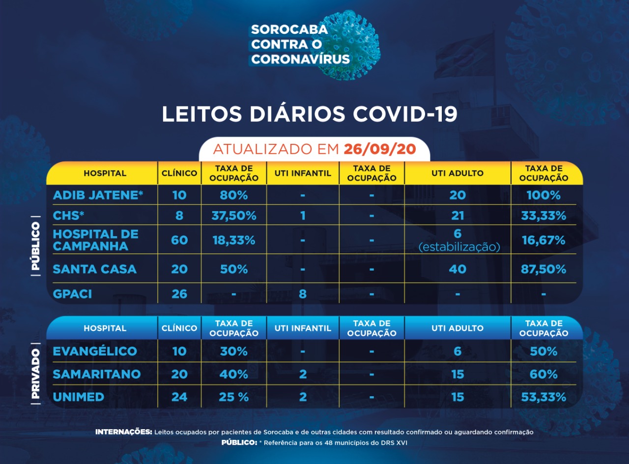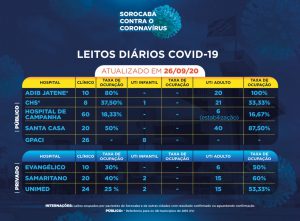 Sorocaba recebeu a notificação de mais 32 novos casos confirmados da Covid-19 neste sábado (26). Do total de confirmados, 46 estão internados (27 em UTI) e o total de pessoas em recuperação (isolamento domiciliar) é 258.