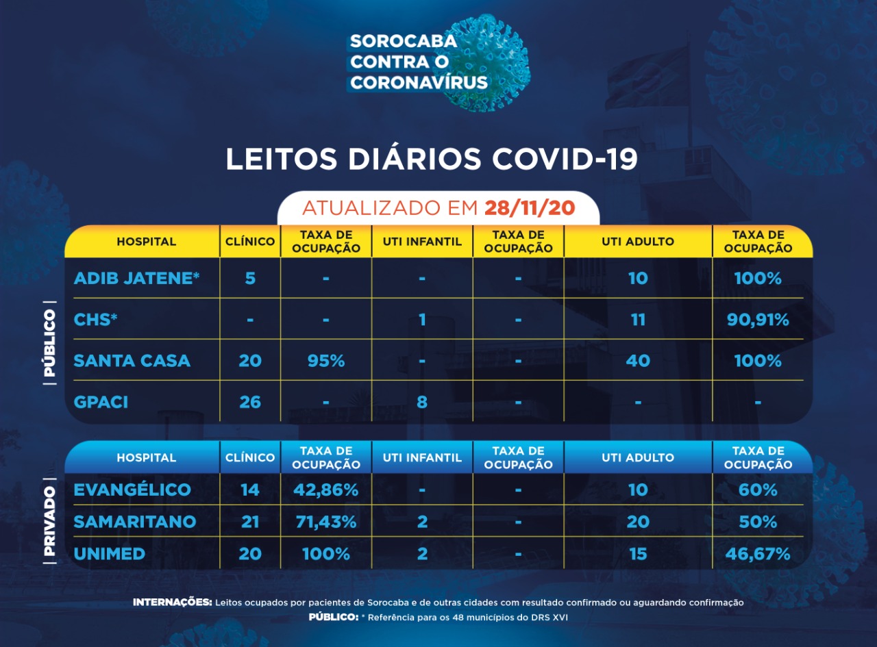 Sorocaba recebeu a notificação de mais 21 novos casos confirmados da Covid-19 neste sábado (28). Do total de confirmados, 88 estão internados (48 em UTI) e o total de pessoas em recuperação (isolamento domiciliar) é 243.