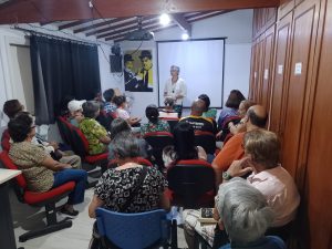“Cineminha terapêutico” é o nome da nova atividade proposta aos frequentadores da Chácara do Idoso, na Vila Progresso. A ação combina uma sessão quinzenal de cinema, seguida de uma roda de conversa, que é conduzida pela terapeuta voluntária Ana Lúcia, em conjunto com o coordenador da unidade, Sergio Marcelo Soler Sauer.