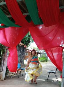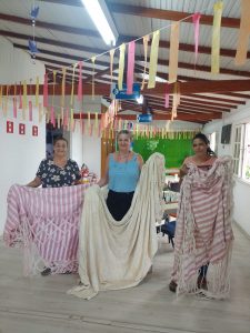 Já, a confecção da tenda cigana e das bandeirinhas que enfeitaram a festa foi feita pelo grupo que realiza artesanato no local.