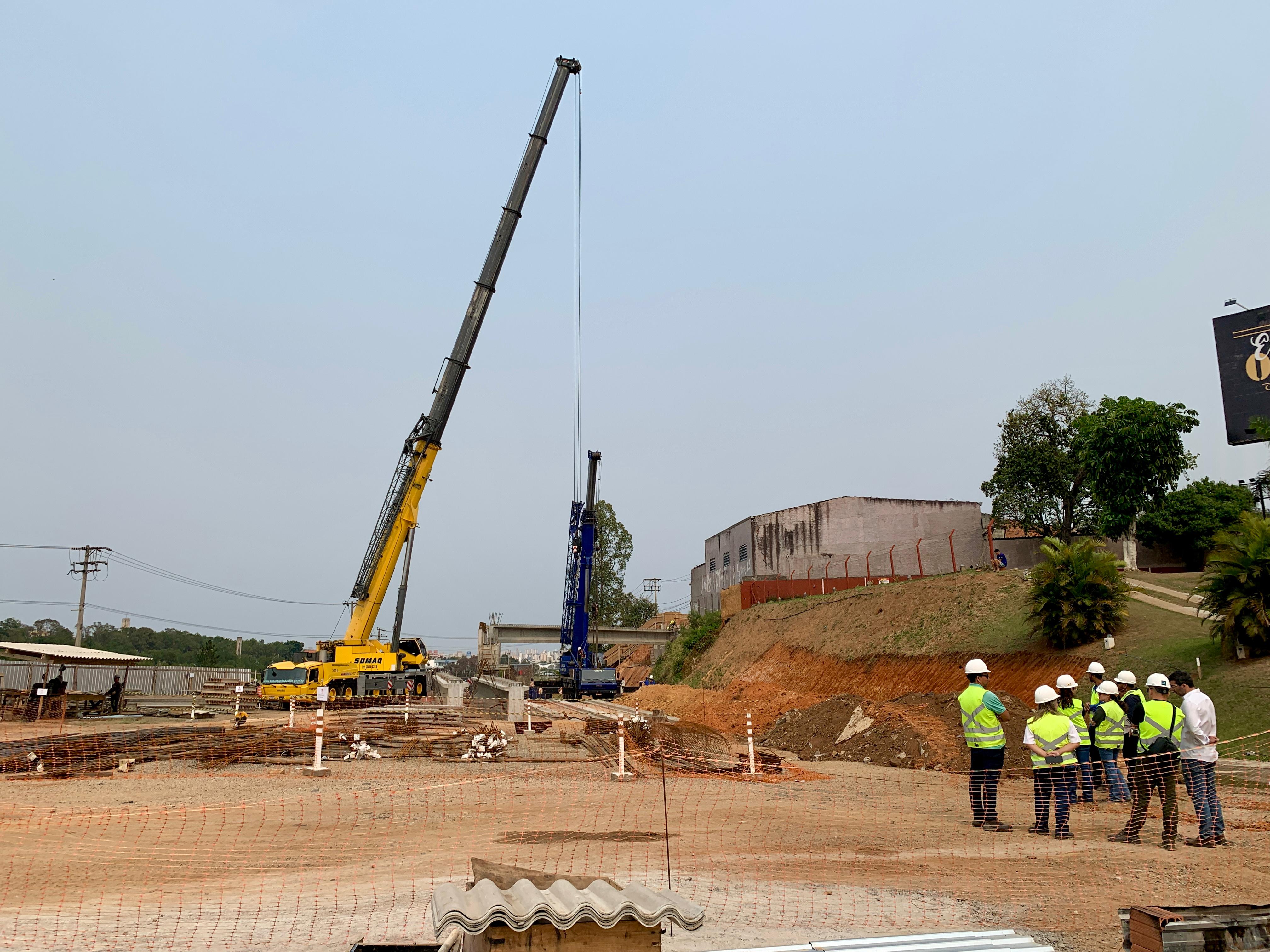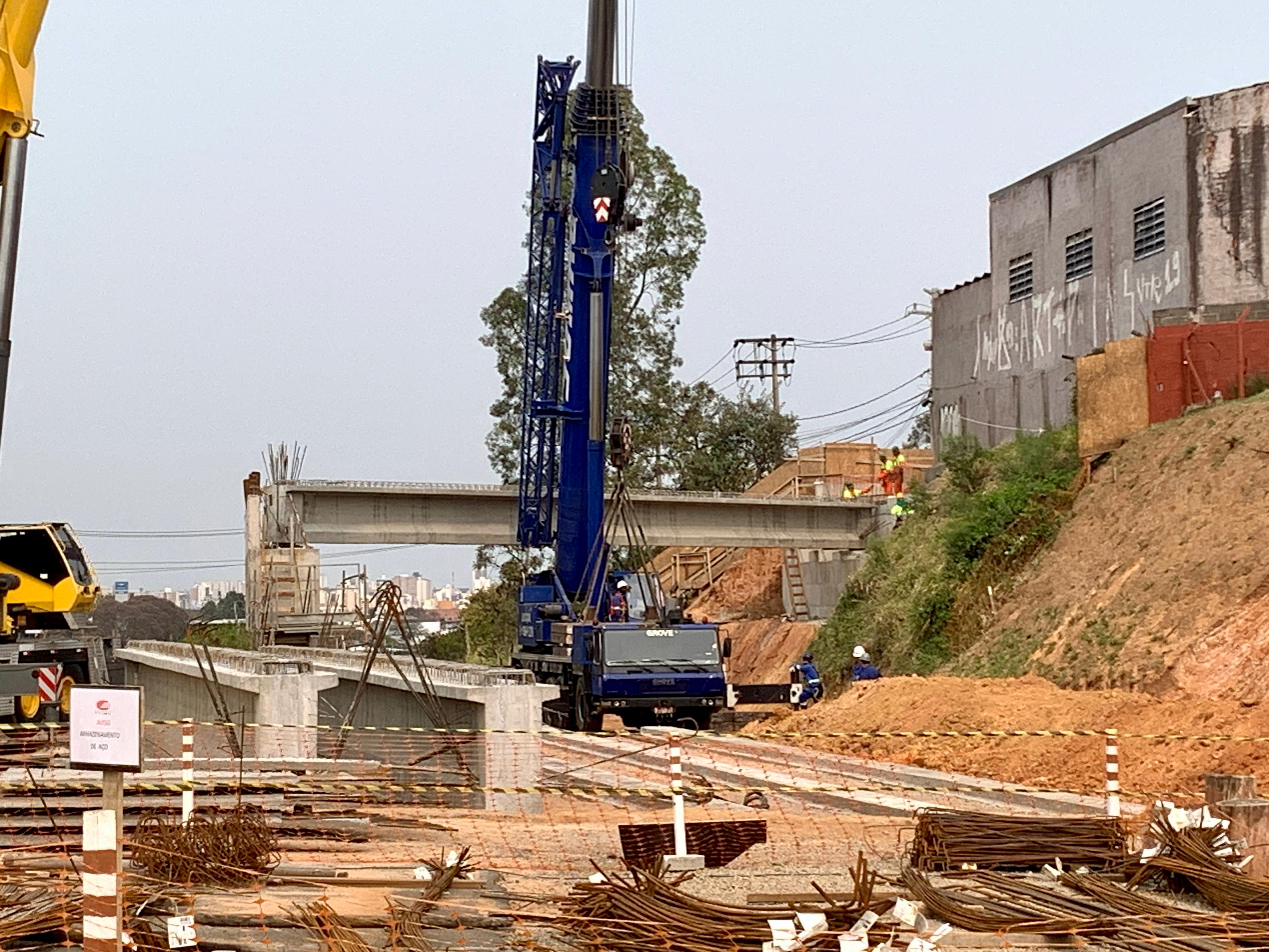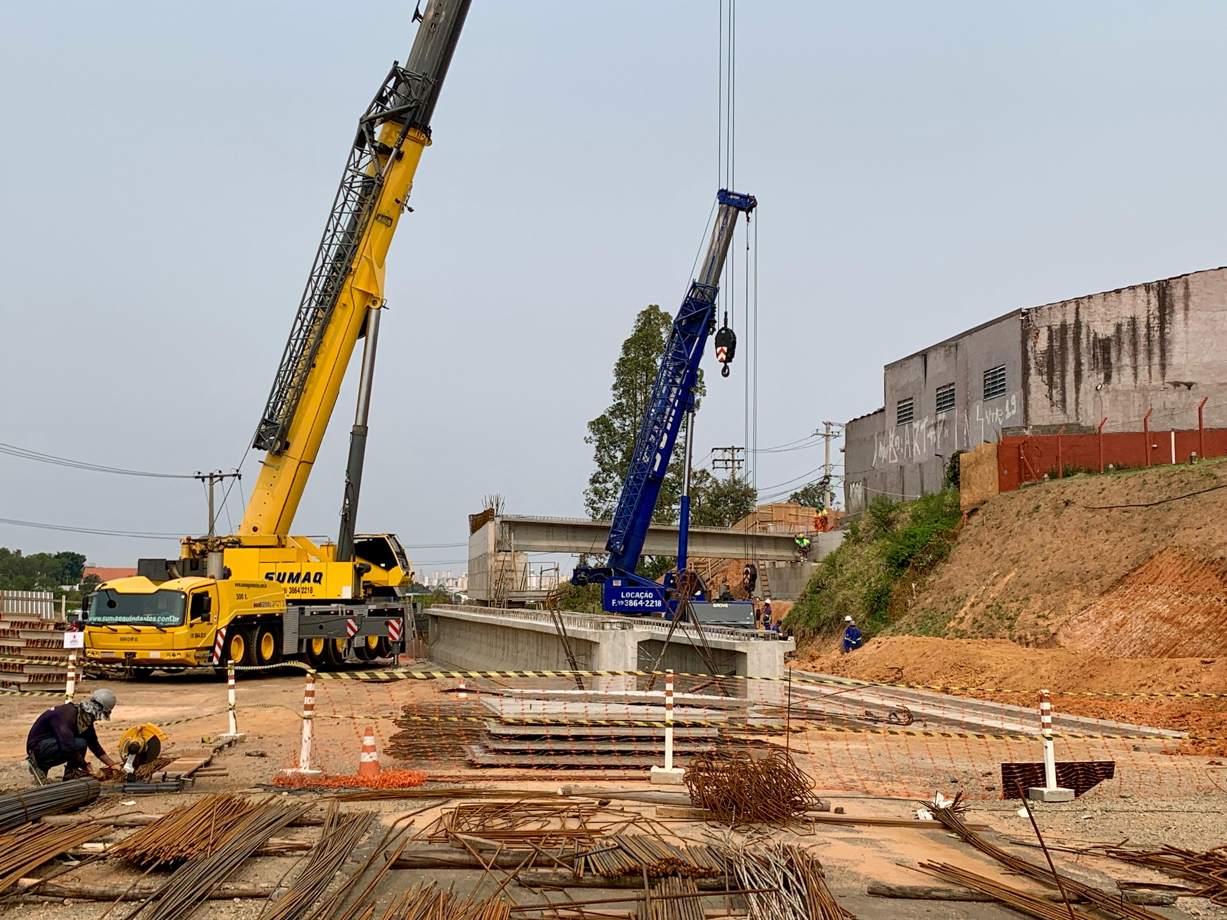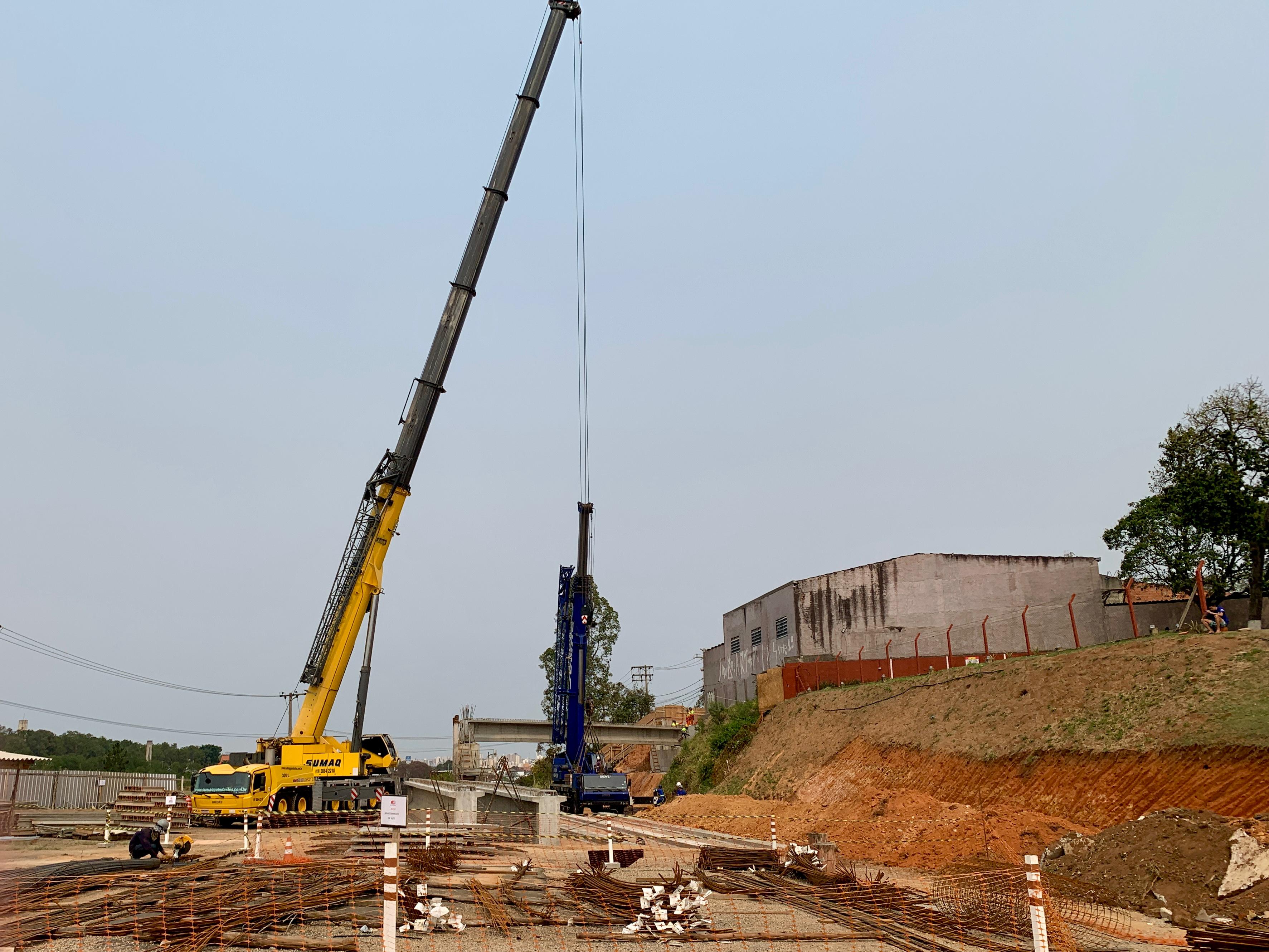 Dois guindastes, com capacidade de 300 e 220 toneladas, foram utilizados para a instalação de cinco vigas pré-moldadas que compõem o tabuleiro do viaduto que vai sobrepor o ramo de ligação entre a Avenida Independência e a Rodovia Dr. José Ermírio de Moraes, a Castelinho (SP-75). Cada uma delas mede 24,9 metros de comprimento e pesa 35 toneladas. A operação foi realizada em quatro horas.