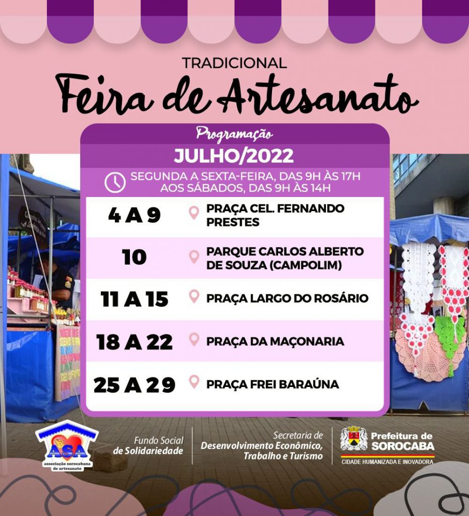 A programação da feira, neste mês de julho, começa nesta segunda-feira (4/7) e se estenderá até sábado, dia 9/7, na Praça “Coronel Fernando Prestes” (Centro). No dia 10/7, seguirá para o Parque “Carlos Alberto de Souza” (Campolim). De 11 a 15/7, as atividades serão na Praça Largo do Rosário (Centro). Na semana seguinte, de 18 a 22/7, será a vez da Praça da Maçonaria (Jardim Paulistano) receber os trabalhos e, por fim, do dia 25/7 ao dia 29/7, a feira será na Praça “Frei Baraúna” (Centro). O horário de funcionamento é sempre das 9h às 17h, de segunda a sexta-feira, e das 9h às 14h, aos sábados.