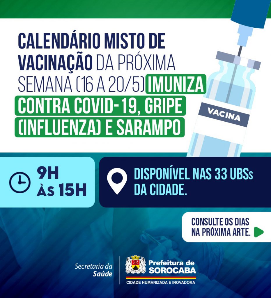 A Prefeitura de Sorocaba, por meio da Secretaria da Saúde (SES), informa o calendário misto de vacinação da próxima semana (16 a 20/5), que imunizará contra Covid-19, gripe (Influenza) e sarampo, nas 33 UBSs (Unidades Básicas de Saúde) da cidade, das 9h às 15h.