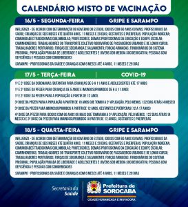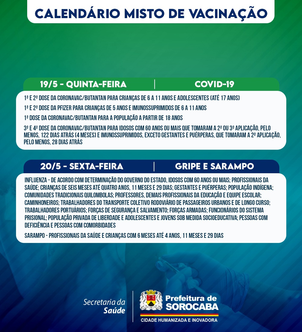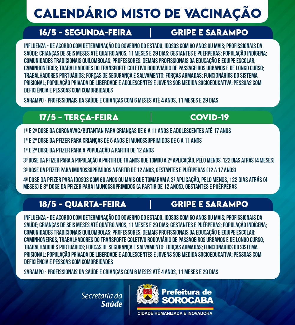 A Prefeitura de Sorocaba, por meio da Secretaria da Saúde (SES), informa o calendário misto de vacinação da próxima semana (16 a 20/5), que imunizará contra Covid-19, gripe (Influenza) e sarampo, nas 33 UBSs (Unidades Básicas de Saúde) da cidade, das 9h às 15h.