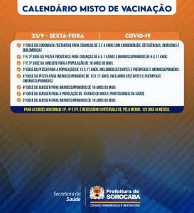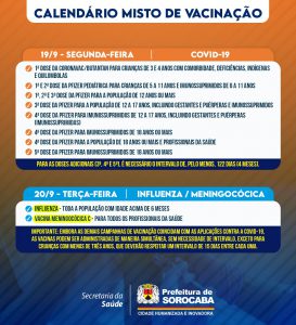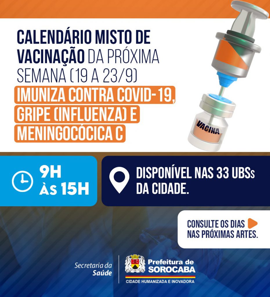 A Prefeitura de Sorocaba, por meio da Secretaria da Saúde (SES), informa o calendário misto de vacinação da próxima semana (19 a 23/9), que imunizará contra Covid-19, gripe (Influenza) e Meningocócica C, nas 33 UBSs (Unidades Básicas de Saúde) da cidade, das 9h às 15h.