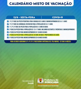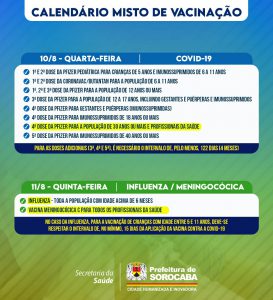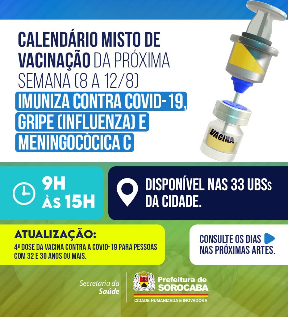 A Prefeitura de Sorocaba, por meio da Secretaria da Saúde (SES), informa o calendário misto de vacinação da próxima semana (8 a 12/8), que imunizará contra Covid-19, gripe (Influenza) e Meningocócica C, nas 33 UBSs (Unidades Básicas de Saúde) da cidade, das 9h às 15h.