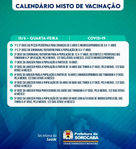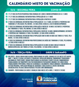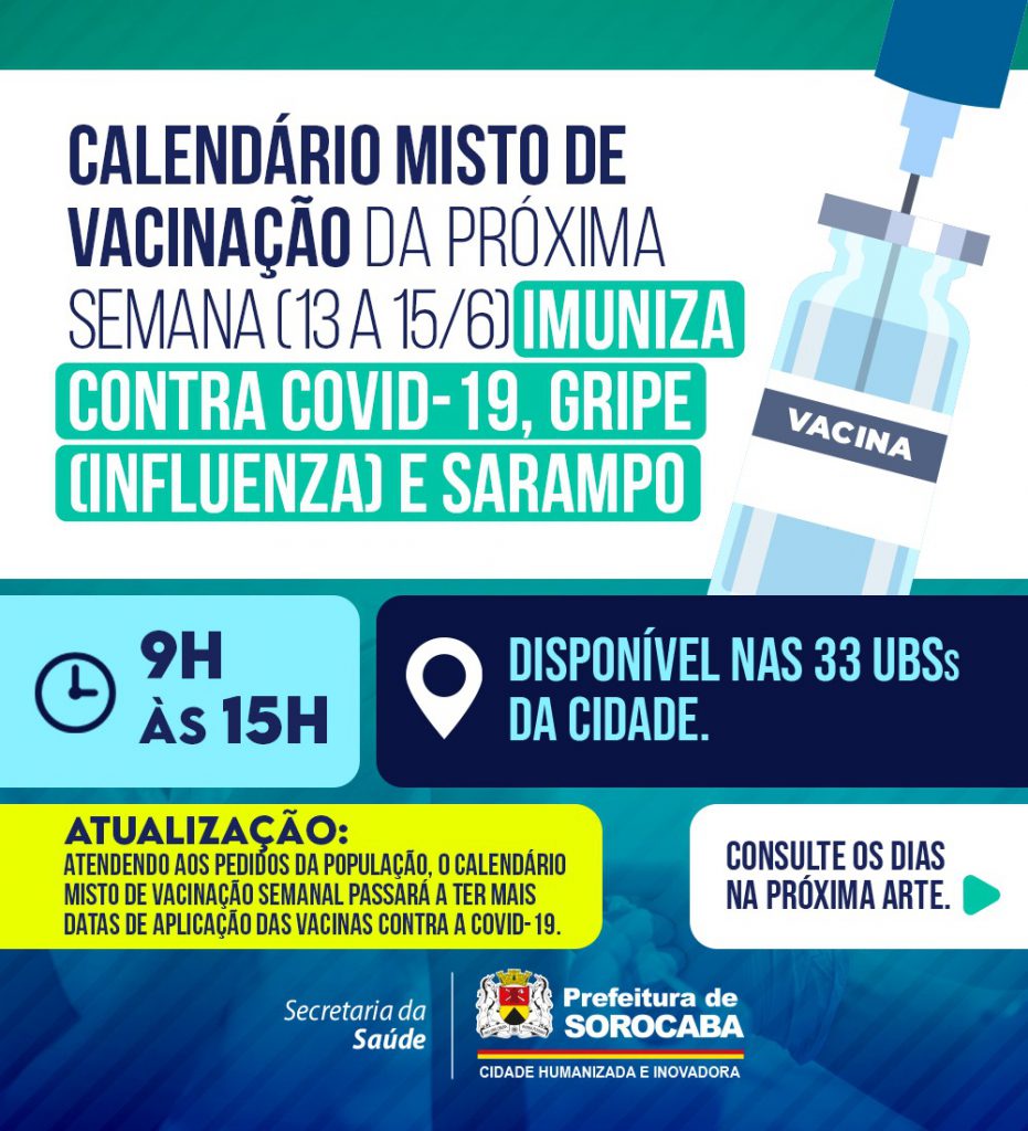 A Prefeitura de Sorocaba, por meio da Secretaria da Saúde (SES), informa o calendário misto de vacinação da próxima semana (13 a 15/6), que imunizará contra Covid-19, gripe (Influenza) e sarampo. Em função do feriado de Corpus Christi, o calendário desta semana seguirá até quarta-feira (15/6), das 9h às 15h, nas 33 UBSs (Unidades Básicas de Saúde) da cidade.