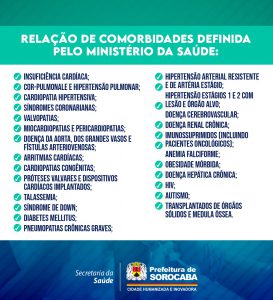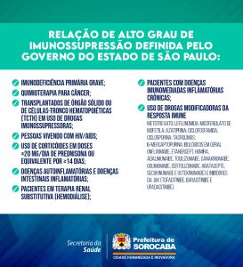 Na próxima semana, na terça-feira (14/6), seguirão sendo imunizados, de acordo com determinação do Governo do Estado, idosos com 60 anos ou mais; profissionais da Saúde; crianças de seis meses até quatro anos, 11 meses e 29 dias; gestantes e puérperas; população indígena; comunidades tradicionais quilombolas; professores, demais profissionais da Educação e equipe escolar (merendeiras, auxiliares de educação, administrativos, inspetor de alunos, auxiliar de limpeza, entre outros); caminhoneiros; trabalhadores do transporte coletivo rodoviário de passageiros urbanos e de longo curso; trabalhadores portuários; forças de segurança e salvamento; forças armadas; funcionários do sistema prisional; população privada de liberdade e adolescentes e jovens sob medida socioeducativa; pessoas com deficiência e pessoas com comorbidades (veja a relação de comorbidades definida pelo Ministério da Saúde).