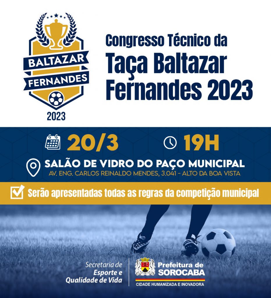 A Prefeitura de Sorocaba, por meio da Secretaria de Esporte e Qualidade de Vida (Sequav), realiza, nesta segunda-feira (20), às 19h, o Congresso Técnico da Taça Baltazar Fernandes 2023, no Salão de Vidro, localizado no andar Térreo do Paço Municipal, no bairro Alto da Boa Vista.