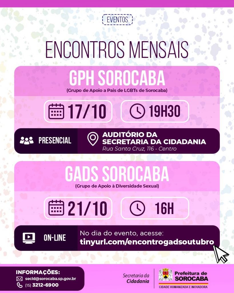 A Coordenadoria de Políticas para a Diversidade Sexual, ligada à Secretaria da Cidadania (Secid) da Prefeitura de Sorocaba, divulga as datas das reuniões programadas para o mês de outubro, com o GPH (Grupo de Apoio a Pais de LGBTs de Sorocaba) e com o GADS (Grupo de Apoio à Diversidade Sexual). O intuito dos encontros é promover a troca de experiências e o fornecimento de informações para a população interessada.