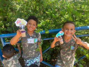 Para finalizar, utilizando materiais recicláveis, cada criança confeccionou uma árvore para apresentar aos amigos e familiares sobre as necessidades e a importância das árvores no meio ambiente.