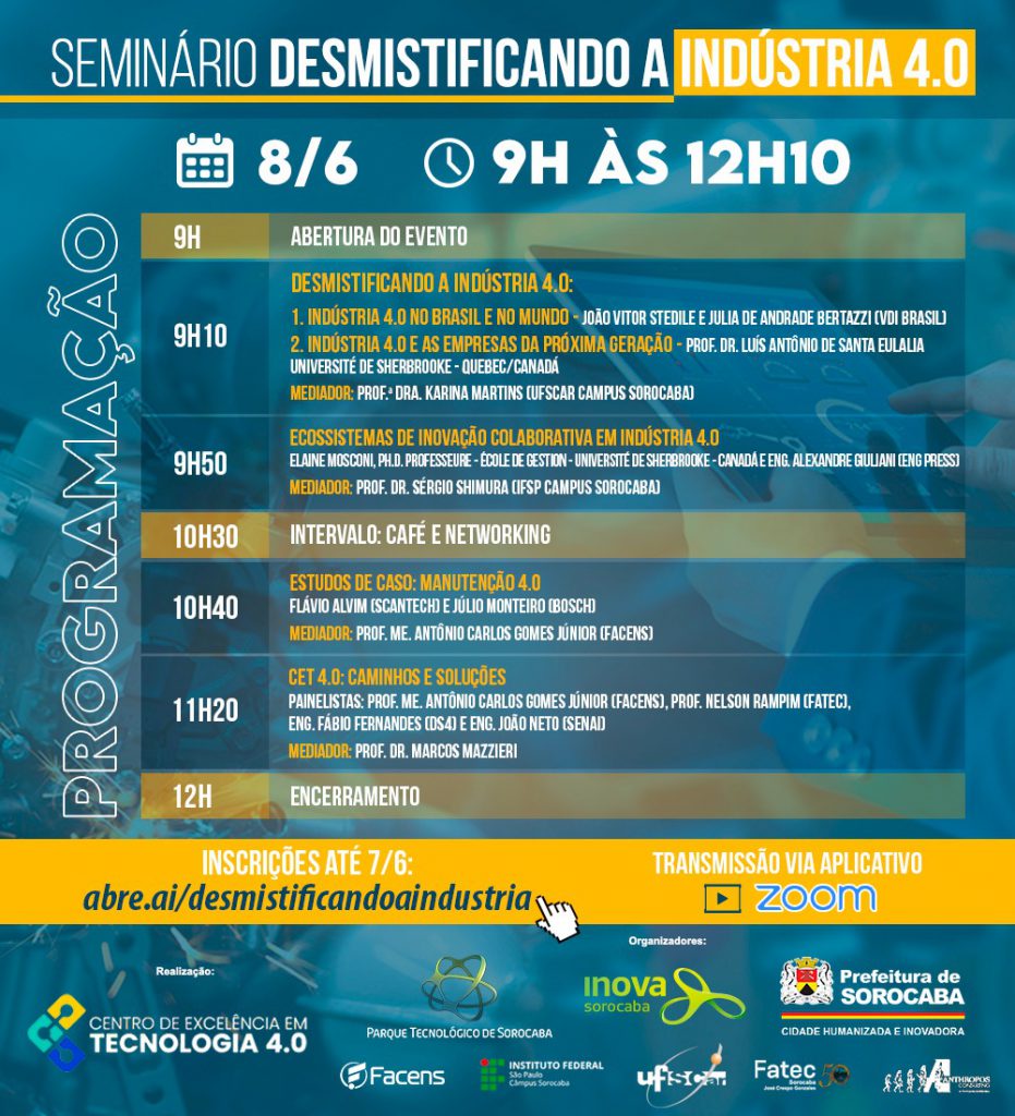 As inscrições já podem ser feitas, até o dia 7/6, pelo link: https://tinyurl.com/desmistificandoaindustria