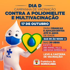 A Prefeitura de Sorocaba, por meio da Secretaria da Saúde (SES), realiza neste sábado (17) o ‘Dia D’ das campanhas contra a poliomielite e de multivacinação. A aplicação das vacinas ocorrerá em 30 Unidades Básicas de Saúde (UBSs) das 8h às 16h30. As UBSs do Wanel Ville e do Jardim Nova Esperança não atenderão neste dia; a primeira por conta de uma manutenção elétrica programada pela CPFL e a segunda em decorrência do furto de fios elétricos que prejudicaram o atendimento à população.
