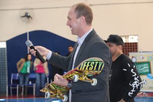 Para participar do encontro e prestigiar as apresentações, foram convidados o prefeito Rodrigo Manga, a secretária da Educação (Sedu), Marlene Manoel da Silva Leite; o secretário de Esporte e Qualidade de Vida (Sequav), Vitor Hugo Tavares, e o vereador Vinicius Aith, que fizeram questão de comparecer na data, e mais as equipes gestoras das duas escolas. “É uma alegria muito grande estar aqui e ver tantas crianças e jovens dedicados a uma prática esportiva com tanta aceitação e crescimento no País, como o skate. E, ainda mais, em uma escola, como a E.M. ‘Matheus Maylasky’ que, assim como todas as outras escolas da rede municipal, após tantos anos de espera, começa a passar por uma completa reforma para a preservação e revitalização de sua estrutura”, ressaltou o prefeito Rodrigo Manga.