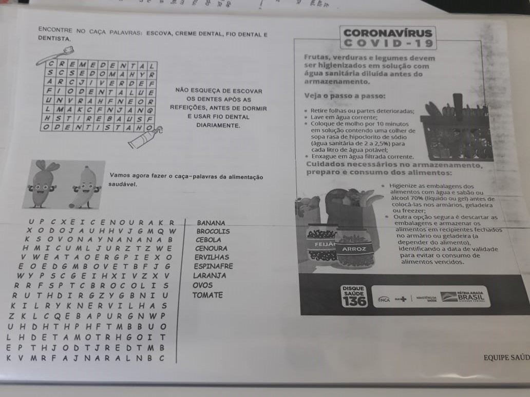 O trabalho é distribuído mensalmente aos alunos em formato digital e impresso com temas sobre prevenção em saúde bucal, cuidados de higiene corporal, a importância da vacina estar em dia, cuidados em tempos da pandemia incluindo várias informações e orientações de prevenção da dengue e alimentação saudável.