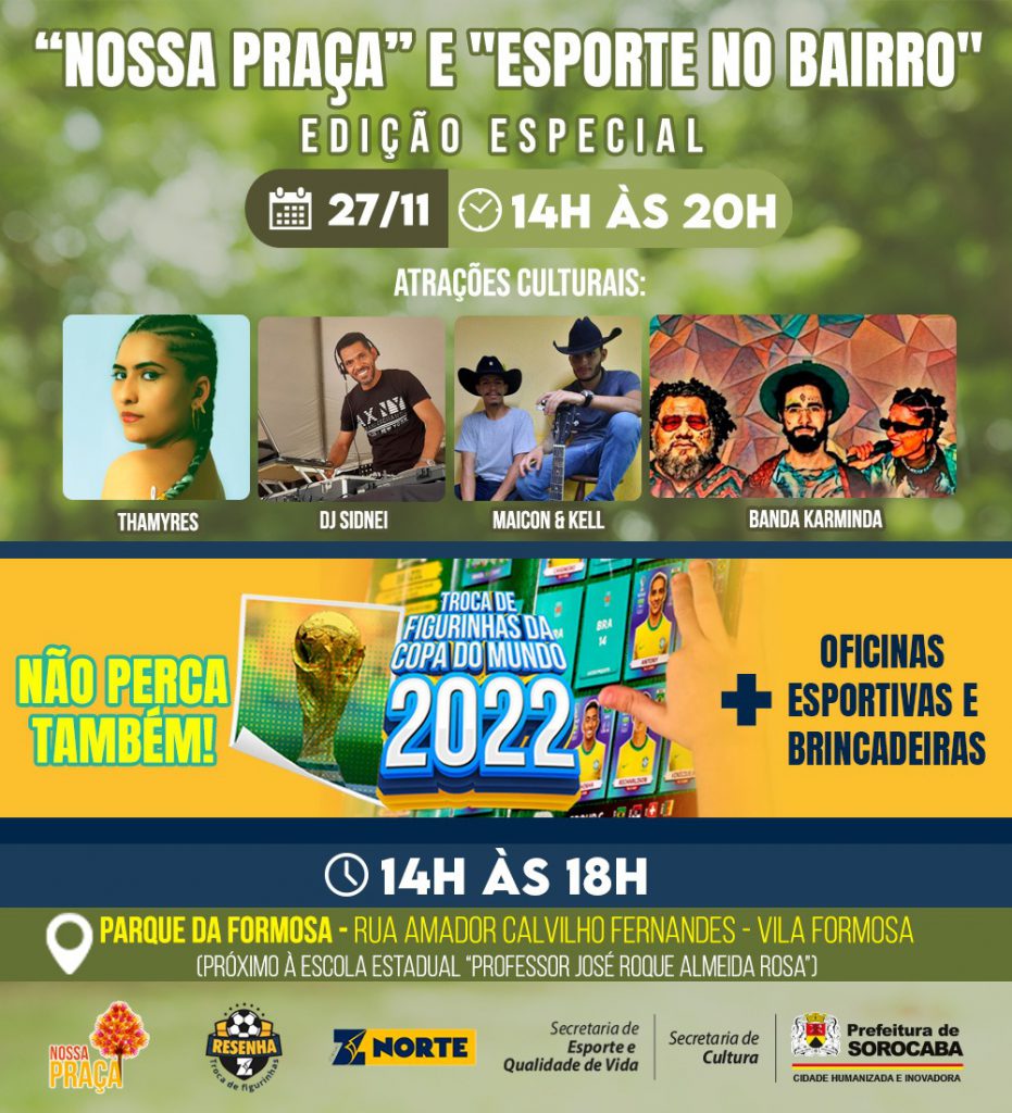 A Prefeitura de Sorocaba, por meio da Secretaria de Cultura (Secult) e da Secretaria de Esporte e Qualidade de Vida (Sequav), realiza, neste domingo (27), uma edição especial dos projetos “Nossa Praça”, das 14h às 20h, e “Esporte no Bairro”, das 14h às 18h, com atrações culturais e oficinas esportivas gratuitas, no Parque da Formosa. Já, das 14h às 17h, a população também poderá participar gratuitamente do evento Resenha Z – Troca de Figurinhas da Copa do Mundo de 2022.
