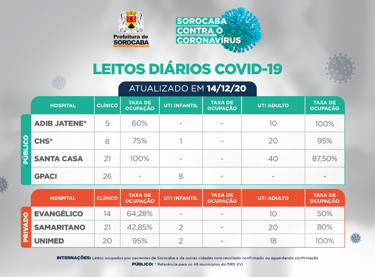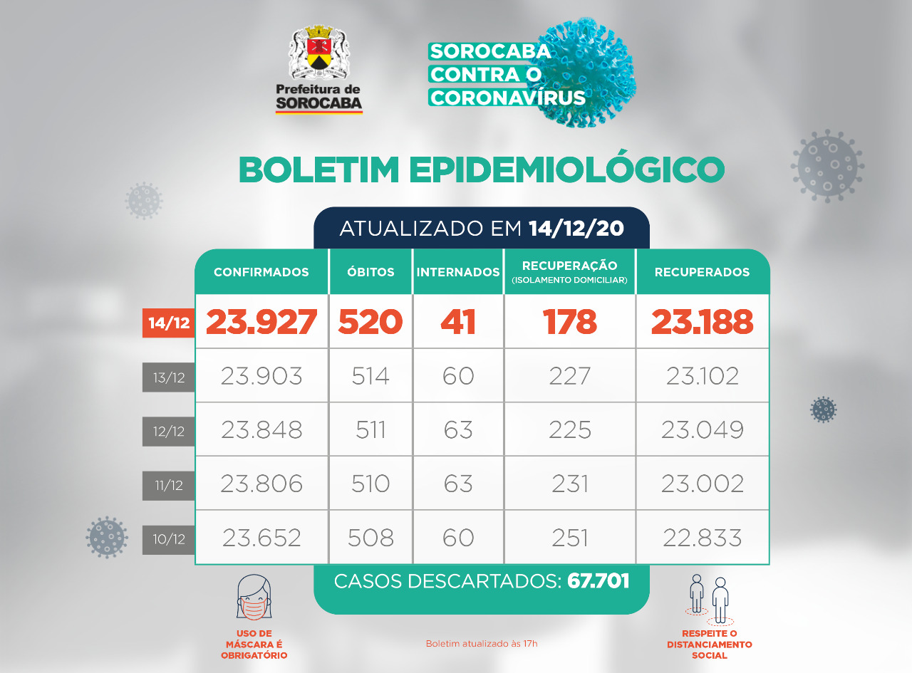 A Prefeitura de Sorocaba, por meio da Secretaria da Saúde (SES), informa que com os dados apurados até esta segunda-feira (14), a cidade acumulou 23.188 recuperados da Covid-19. Já os casos confirmados com a doença passaram de 23.903 para 23.927 na cidade. Os óbitos com a confirmação da doença aumentaram para 520. A Secretaria da Saúde alerta, entretanto, que os números podem não refletir a realidade com absoluta precisão, pois o Sistema eSUS Notifica, do Ministério da Saúde, está passando por manutenção e não está exportando todos os dados. Isso inviabiliza o levantamento do número atualizado de casos confirmados, descartados e em isolamento domiciliar.