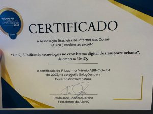 Instalada no Parque Tecnológico de Sorocaba (PTS), a UniQ, empresa responsável pelo desenvolvimento dos programas que gerenciam os sistemas usados no Bus Rapid Transit (BRT) no município, conquistou o 1º lugar no Prêmio ABINC de IoT de 2023, na categoria Soluções para Governos/Infraestrutura. Em maio deste ano, a empresa já havia conquistado a segunda colocação, na categoria Inovação, na 3ª edição do Prêmio Vozes da Mobilidade, organizado pelo grupo Estadão.