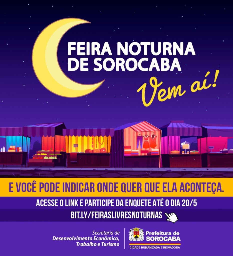 A Prefeitura de Sorocaba, por meio da Secretaria de Desenvolvimento Econômico, Trabalho e Turismo (Sedettur), realizará, de forma inédita, feiras-livres noturnas na cidade, que acontecerão das 17h às 21h.