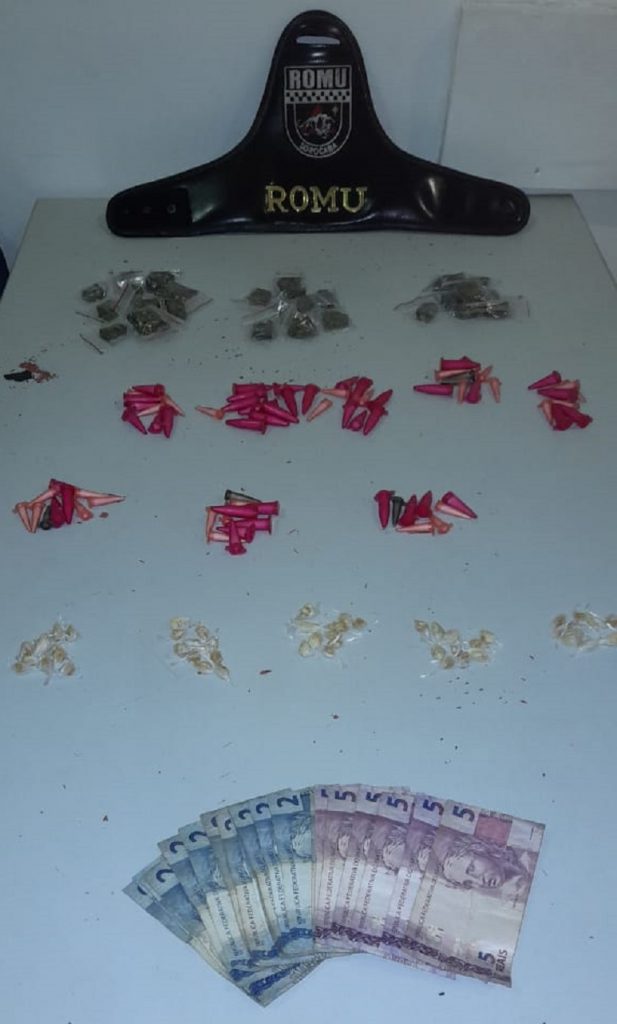 Na sequência, ele foi abordado pelos guardas municipais que, ao revistá-lo, encontraram uma quantidade de drogas na bolsa que ele portava, sendo 78 pinos de cocaína, 28 porções de maconha, 52 pedras de crack, além de R$ 62 em dinheiro. No total, foram apreendidas 158 porções de entorpecentes.