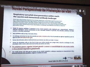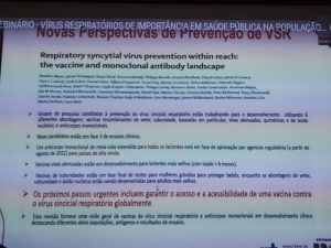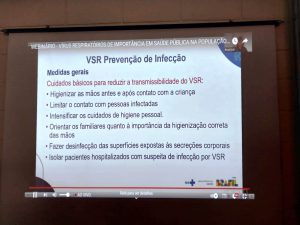 Também foi abordado o tema sobre a importância da vacinação para os variados tipos de infecções respiratórias, abrangência de grupos, como pais, irmãos e cuidadores das crianças, incluindo profissionais da saúde que lidam com prematuros. Foram discutidos, ainda, os tópicos sobre aleitamento materno e uso, conforme protocolo específico, de Palivizumabe (anticorpo produzido por tecnologia para prevenir doenças graves causadas por infecções respiratórias).