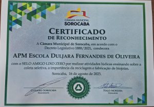 A escolha da E.M. “Duljara Fernandes de Oliveira” para receber o certificado se deu em razão de terem sido realizadas, em parceria com o Coletivo Lixo Zero, diversas ações pela unidade escolar em prol da Educação Ambiental, entre elas palestras, oficinas de biojoias, recolhimento de óleo de cozinha usado para a produção de sabão, utilizando esses resíduos em uma oficina junto a uma pessoa moradora do bairro.