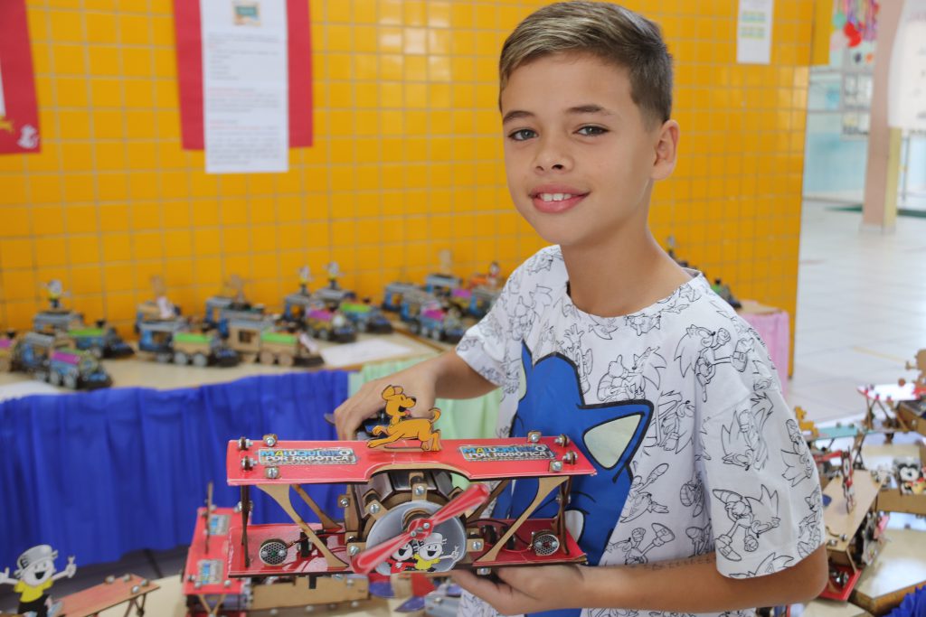 A tecnologia também esteve presente nos inúmeros dispositivos e brinquedos, com ações acionadas por meio de recursos de robótica. Assim, alunos do 1º ao 5º ano receberam as aulas de Robótica em sala de aula e montaram os kits, personalizando-os, inclusive. David, do 3º ano, fez questão de mostrar para a mãe o avião que montou, seguindo todas as orientações recebidas em aula. “Foi muito legal montar o avião e ver ele funcionando. Fiquei feliz, porque fui eu quem fiz!”