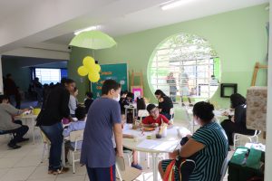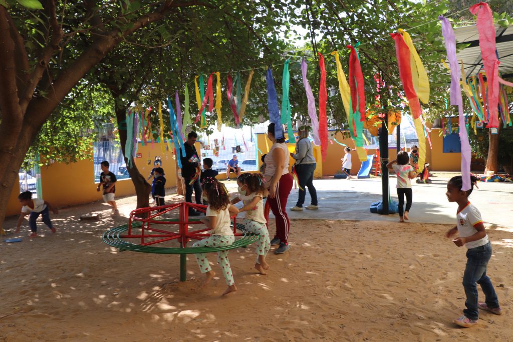 Além das brincadeiras em diferentes espaços da escola, os pais também assistiram a vídeos informativos sobre a função pedagógica do brincar, puderam participar de oficinas junto das crianças, como a de contação de histórias e produção de balangandãs, e ainda puderam compartilhar o lanche servido para todos.