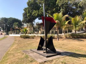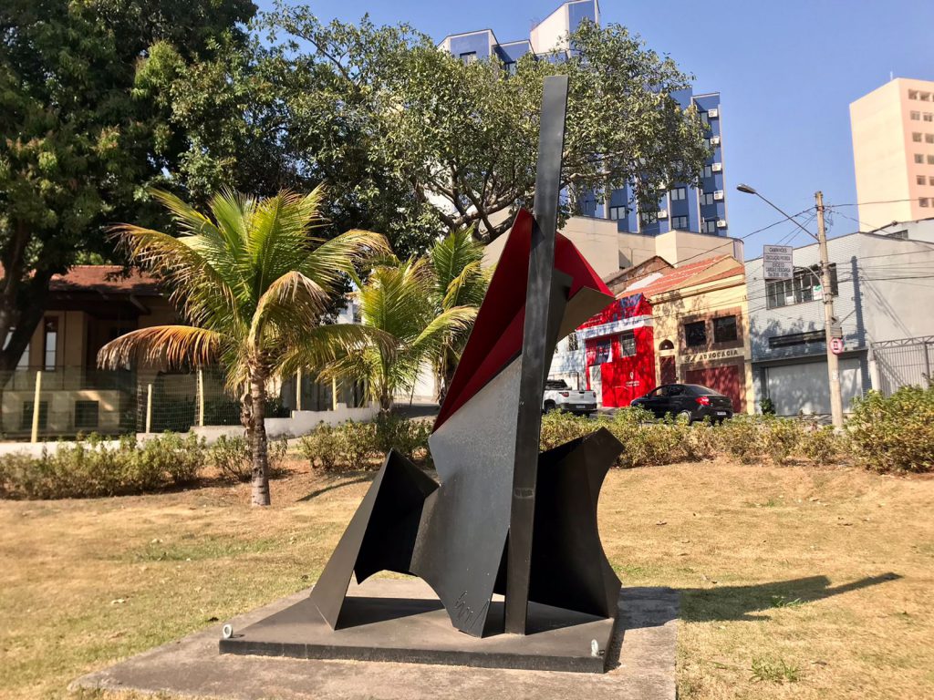Escultura de grandes dimensões do MACS é exposta ao ar livre no jardim em frente ao Chalé Francês