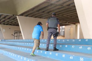 A vistoria da PM foi realizada pelo Capitão Massoni Neto, que percorreu diferentes espaços do estádio para verificar questões importantes para garantir a segurança de todos, como as grades ao redor do estádio, portões de acesso, banheiros, entre outras. O trabalho foi acompanhado pelo servidor da Sequav, Edmilson Chelles, e o diretor de área da Secretaria de Relações Institucionais (Serim), Rodrigo Rodrigues Machado, que representou, na ocasião, o secretário de Esporte e Qualidade de Vida, Luiz Henrique Galvão.