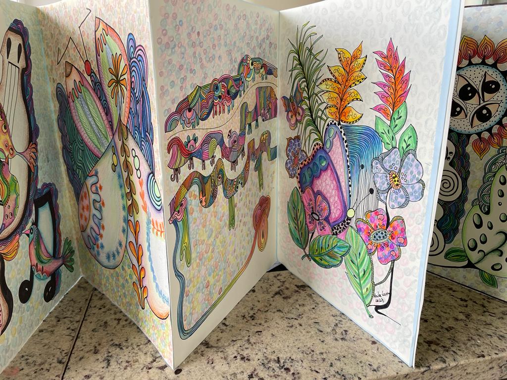Nas obras, a artista plástica utiliza papéis, lápis de cor, nanquim, tintas, entre outros materiais criativos, para falar sobre esses temas e passar a sensação de contemplação das belezas do planeta Terra.