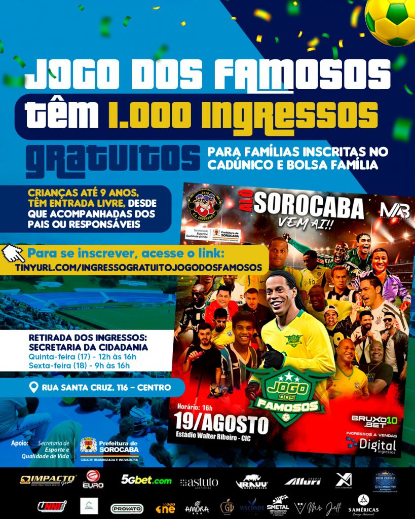 As famílias em situação de vulnerabilidade social de Sorocaba terão a oportunidade de conferir, de forma gratuita, o “Jogo dos Famosos”, com a Seleção do Ronaldinho Gaúcho e a Seleção da cidade de Sorocaba, neste sábado (19), às 16h, no Estádio Municipal “Walter Ribeiro” (CIC). Essas vagas gratuitas são limitadas a 1.000, no total e, por isso, é necessário que cada morador que possui inscrição atualizada no CadÚnico (Cadastro Único) e no Bolsa Família se inscreva, pelo link: https://tinyurl.com/ingressogratuitojogodosfamosos. Crianças até 9 anos, desde que acompanhadas dos pais ou responsáveis, têm entrada liberada.