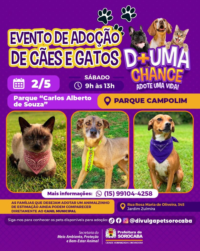 A Prefeitura de Sorocaba, por meio da Secretaria do Meio Ambiente, Proteção e Bem-Estar Animal (Sema), realizará, neste sábado (2), das 9h às 13h, a feirinha de adoção de cães e gatos no Parque “Carlos Alberto de Souza”, no Parque Campolim. Todos os animais são vacinados, castrados e microchipados.