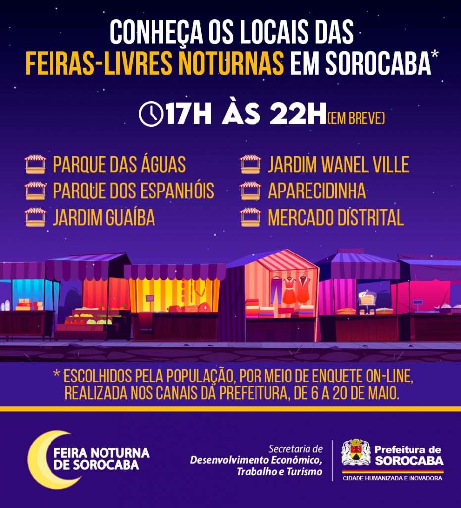 A Prefeitura de Sorocaba, por meio da Secretaria de Desenvolvimento Econômico, Trabalho e Turismo (Sedettur), anuncia os locais das feiras-livre noturnas na cidade, que acontecerão, pela primeira vez, das 17h às 22h, em seis locais diferentes, sendo eles:  Parque das Águas, Parque dos Espanhóis, Jardim Guaíba, Jardim Wanel Ville, Aparecidinha e Mercado Distrital.