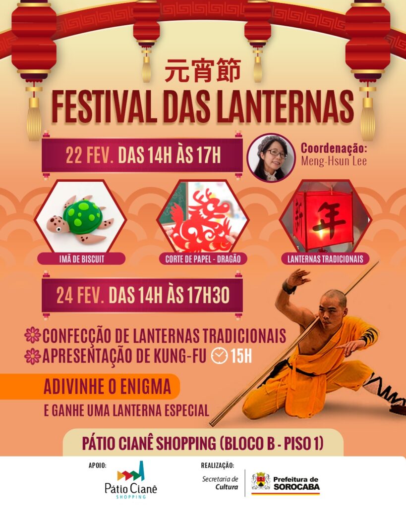 As famílias sorocabanas poderão participar, nos dias 22 e 24 de fevereiro, de uma programação do Festival das Lanternas, com a professora de mandarim e cultura oriental Meng-Hsun Lee, no Pátio Cianê Shopping, localizado no Centro da cidade. As atividades ocorrerão no Bloco B do empreendimento, no Piso 1.