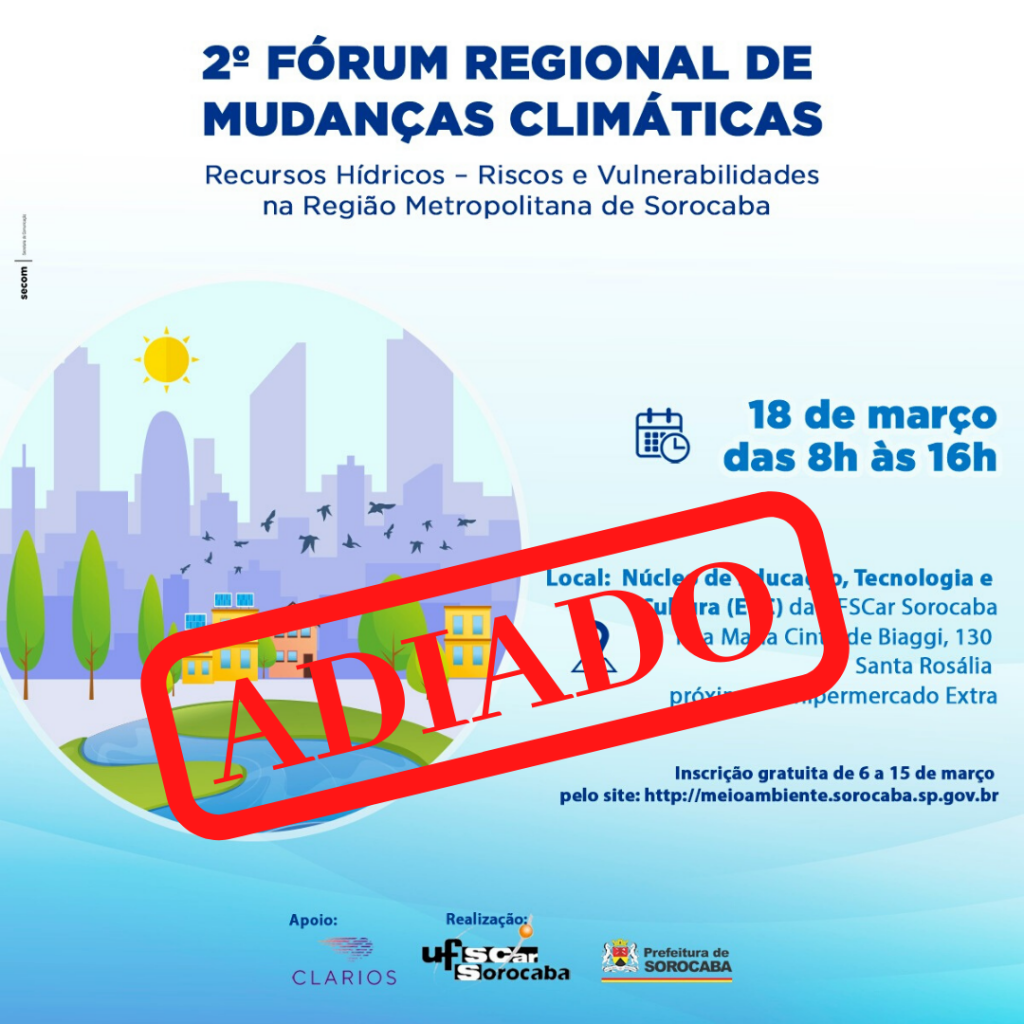 A Prefeitura de Sorocaba, por meio da Secretaria do Meio Ambiente e Sustentabilidade (Sema), informa que o 2˚ Fórum Regional de Mudanças Climáticas foi adiado em data a ser definida, em razão da situação de emergência em saúde pública no Brasil devido à propagação do COVID-19. Em nota divulgada no domingo (15), a prefeita Jaqueline Coutinho solicitou o cancelamento de eventos programados para as próximas duas semanas.