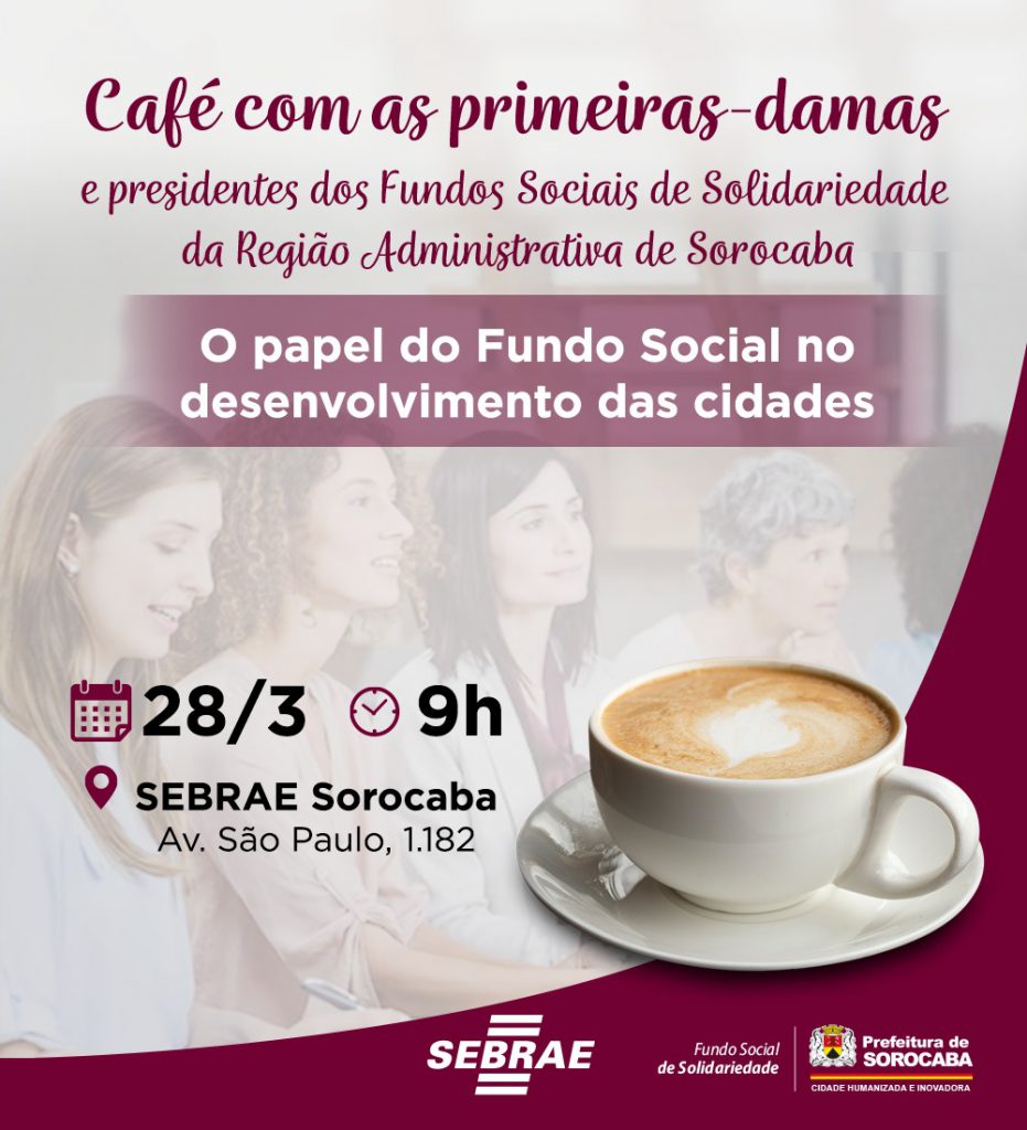A Prefeitura de Sorocaba, por meio do Fundo Social de Solidariedade, e o Sebrae (Serviço de Apoio às Micro e Pequenas Empresas) realizam, na próxima terça-feira (28), o encontro “Café com as primeiras-damas”, que vai reunir as primeiras-damas e presidentes dos Fundos Sociais de Solidariedade de toda a Região Administrativa de Sorocaba.