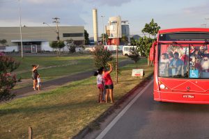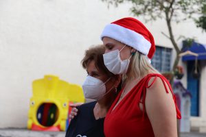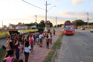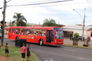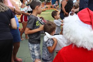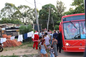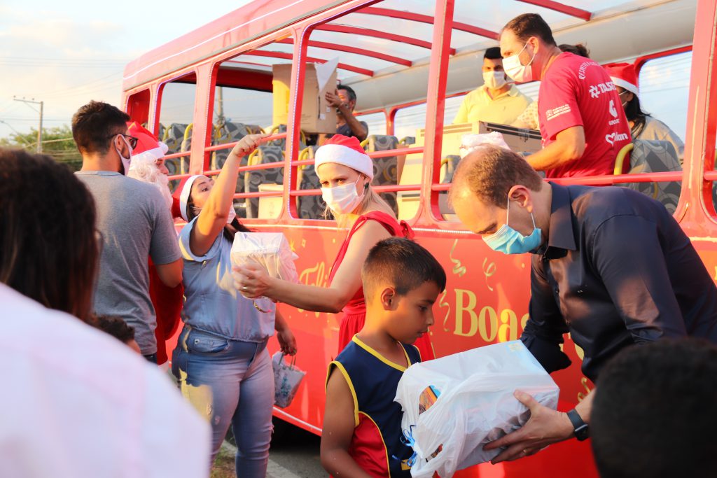 Quando o ônibus iluminado e com mensagem de Boas Festas chegou, trazendo o prefeito, a primeira-dama e comitiva, uma fila de cerca de 800 crianças já aguardava ansiosa, no Habiteto.