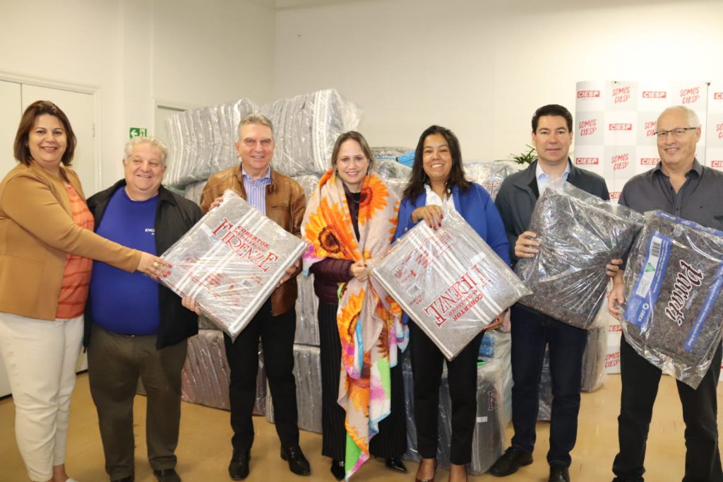 O Fundo Social de Solidariedade de Sorocaba recebeu, na manhã desta sexta-feira (7), um total de 840 cobertores arrecadados pela campanha feita em parceria com a Regional Sorocaba do Centro das Indústrias do Estado de São Paulo (Ciesp) e seu Núcleo de Jovens Empreendedores (NJE). A ação de entrega dos itens arrecadados ocorreu na sede do Ciesp Sorocaba, contando com a participação da primeira-dama e presidente do FSS, Sirlange Frate Maganhato, e do diretor titular do Ciesp Sorocaba, Erly Domingues de Syllos, ao lado da coordenadora do Núcleo de Jovens Empreendedores (NJE) do Ciesp Sorocaba, Débora Souza.