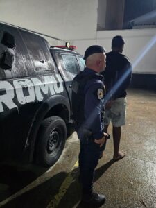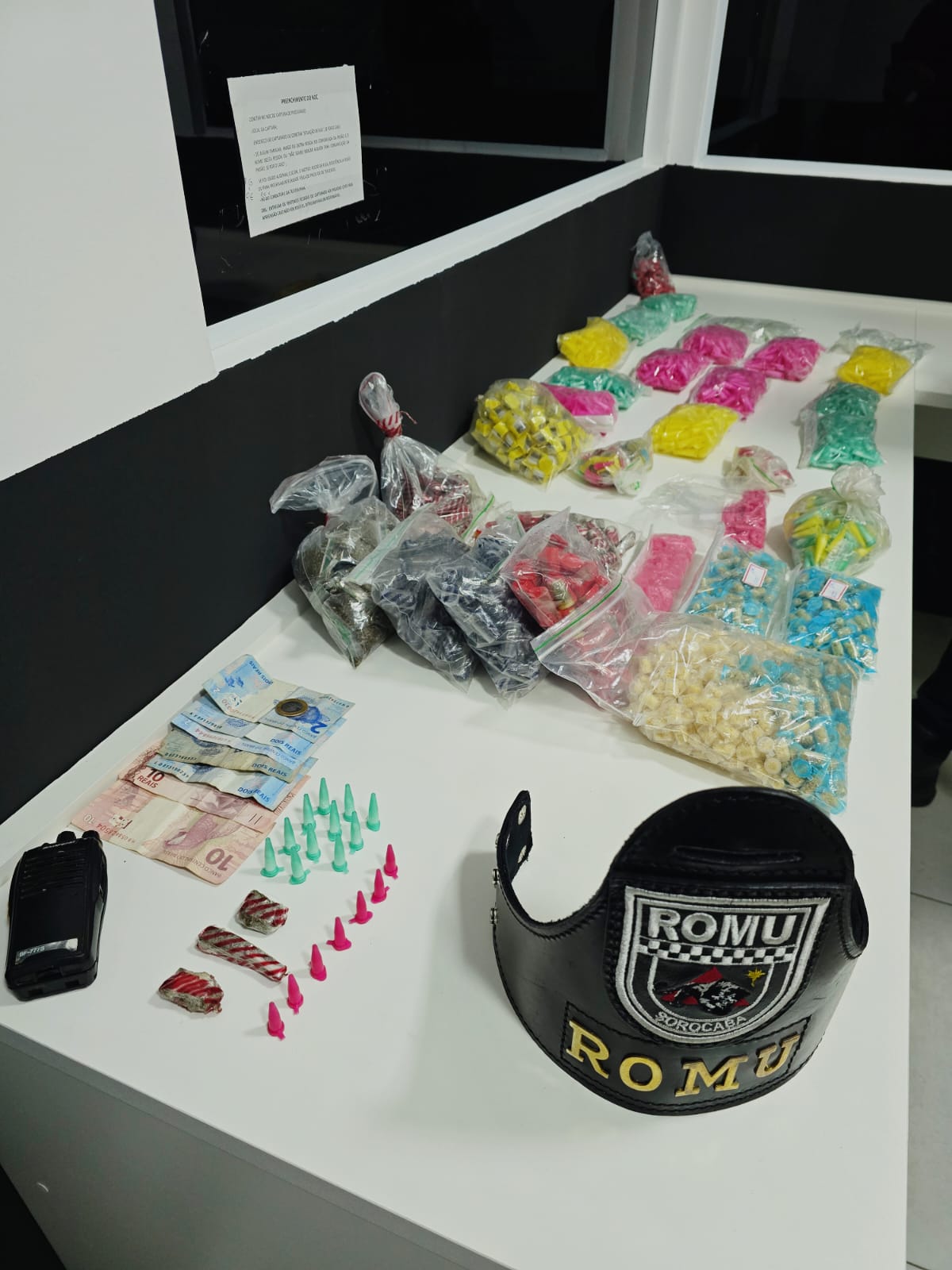 Um homem foi avistado pela equipe, portando rádio comunicador na Rua Sofia Scotto, à 0h20. Ao perceber a aproximação da viatura, ele empreendeu fuga, sendo alcançado e detido. Durante busca pessoal foram localizadas 10 porções de cocaína, sete de crack, três de maconha, além de R$ 30 em dinheiro