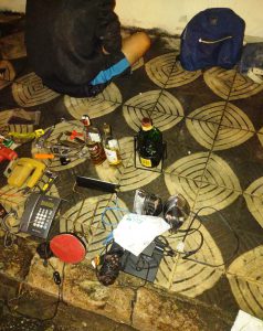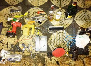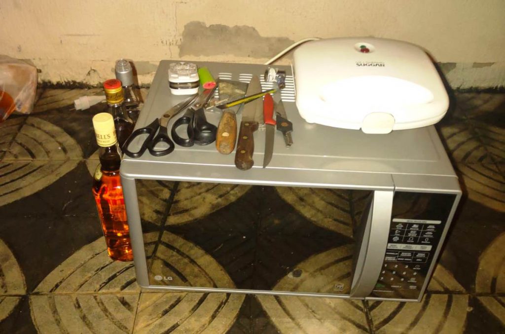 Um dos suspeitos carregava uma caixa plástica e o outro, um saco preto, ambos contendo os objetos. No momento da abordagem pela GCM, os suspeitos alegaram que tinham encontrado os objetos em um contêiner de lixo. Porém, a história despertou suspeita, pois havia também bebidas lacradas, assim como videogame, parafusadeira e serra elétricas, ferros de passar, roupas, telefone, tesoura, facas e uma sanduicheira.