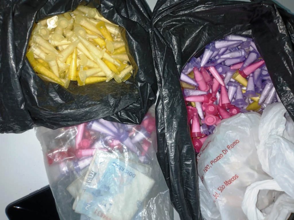 Ao retornar ao local onde o casal foi avistado inicialmente, os guardas encontraram uma sacola plástica, contendo 260 porções de crack, 317 de cocaína e 38 de maconha. Os entorpecentes estavam embalados da mesma forma que aqueles localizados em posse da dupla, que admitiu estar ali traficando.