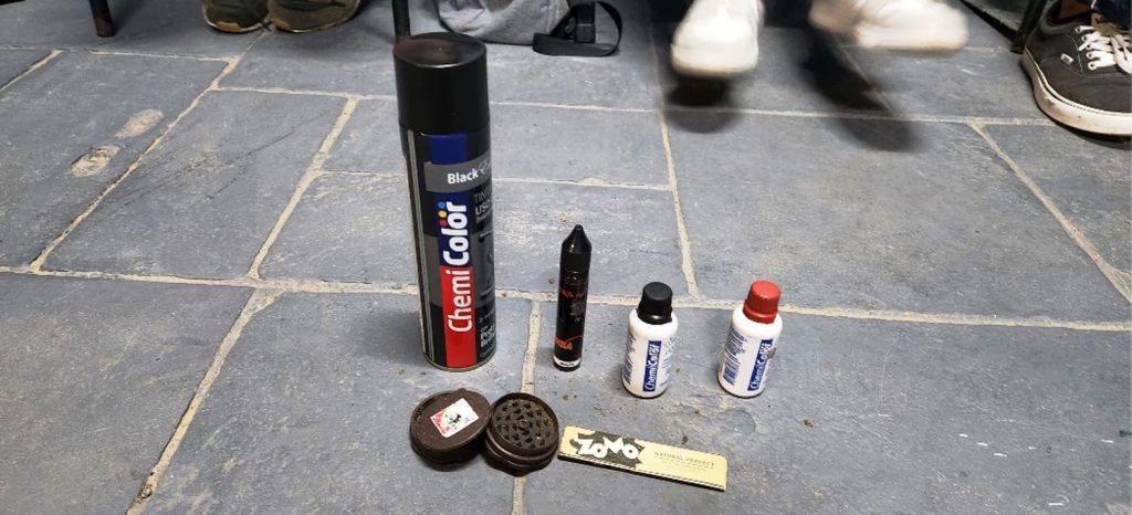 Porém, dois dos adolescentes foram abordados e confirmaram o ato. Na pochete de um deles, havia duas bisnagas, sendo uma de tinta preta e outra vermelha, as mesmas cores presentes na pichação do quiosque. Também foi recolhida com eles uma lata de tinta spray.