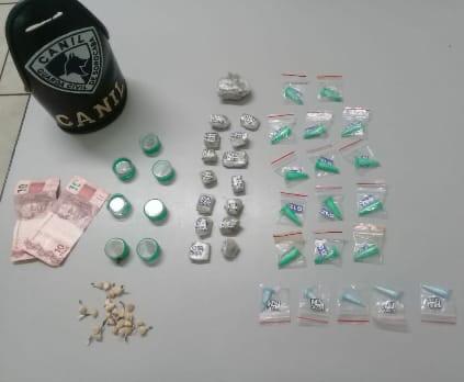 Após receber denúncia de morador local, a equipe do canil da GCM foi ao local com o cão Glock, um pastor Belga Malinois, e localizou entorpecentes escondidos em uma praça do conjunto habitacional. Foram encontradas 7 porções de skank; 23 de crack, 15 de maconha e 19 de cocaína, além de R$ 20,00.