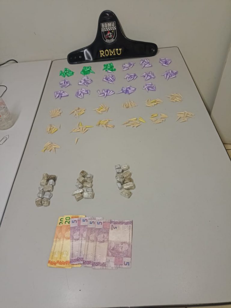 Suspeitando da atitude do homem, a equipe policial realizou abordagem e verificou que ele estava de posse de quatro pinos de crack, dois de cocaína e R$ 60 em dinheiro. Em seguida, foi feita vistoria também no contêiner, onde foi localizada a sacola plástica, que continha mais 166 pinos de cocaína, 127 pinos de crack e 60 porções de maconha.