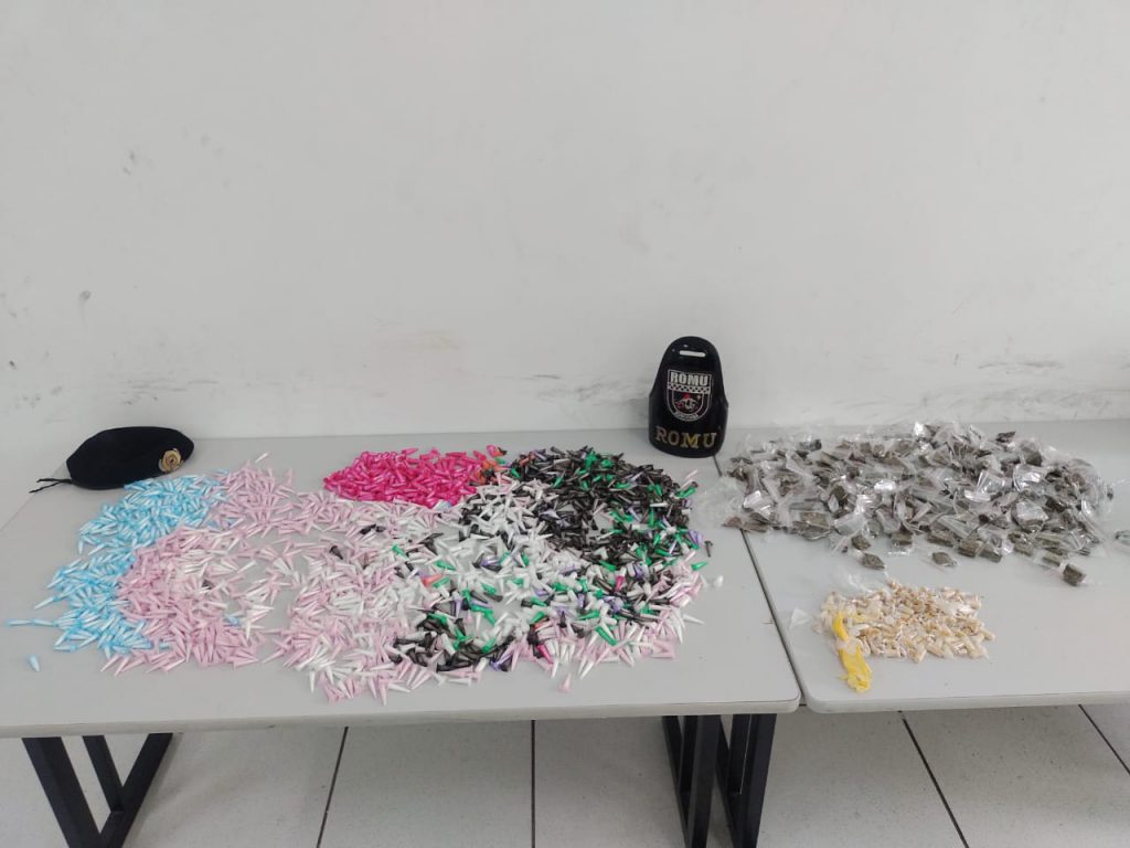 Enquanto isso, os outros integrantes da guarnição da Romu abordaram o veículo e o outro suspeito. Em um saco preto, havia 2.017 porções de cocaína e 200 de maconha. O rapaz anteriormente detido disse aos GCMs que ele estaria abastecendo os pontos de tráfico do bairro e ainda iria deixar drogas em mais dois locais.