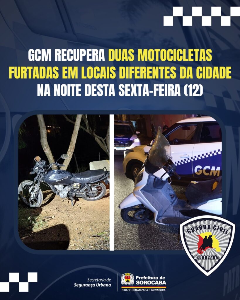 A Guarda Civil Municipal (GCM) de Sorocaba recuperou, na noite desta sexta-feira (12), duas motocicletas em locais diferentes. Um veículo foi encontrado na região central e o outro na Vila Barão, zona oeste da cidade.