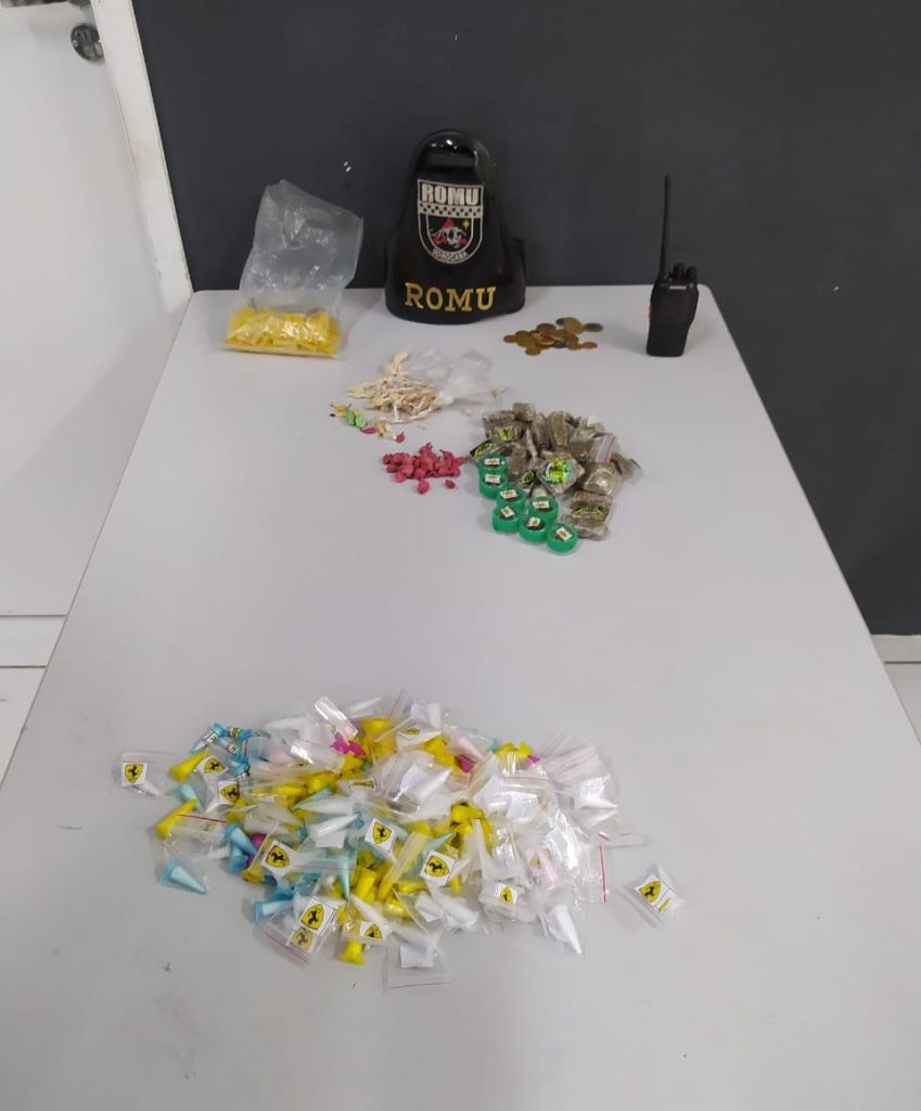Ao revistá-lo, foram encontrados com ele, na sacola, 49 porções de maconha, 230 microtubos de cocaína e 275 pedras de crack, além de um rádio comunicador e a quantia de R$ 5,75 em dinheiro. No total, foram apreendidas 554 porções de entorpecentes.