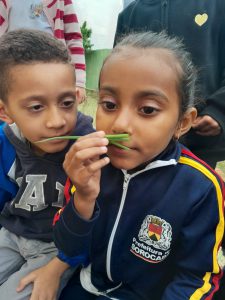 Lauren e Emanuele, ambas de 10 anos, no 5º ano do Ensino Fundamental na E.M. “Maria Domingas Tótora de Góes”, são duas alunas que estão participando do projeto de cultivo da horta e tiveram, também, a oportunidade de colher os alimentos e de levar algumas das hortaliças para casa. “Estou achando muito legal e conheci verduras que eu não tinha provado antes, como a chicória. Gostei!”, diz Lauren. Para Emanuele, a descoberta, além da chicória, foi o almeirão. “Demora um pouco para crescer. Para ajudar, precisamos regar toda semana. Levamos também um temperinho para cuidar em casa e minha mãe gostou muito”, conta.